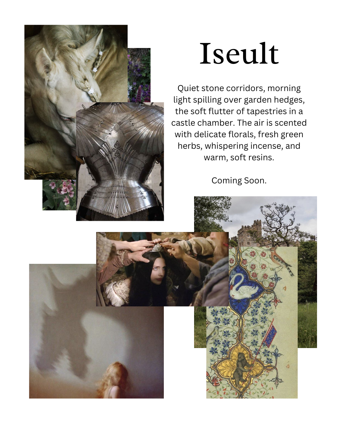 A companion piece to Aqua Reginae Hungarie, inspired by an extant formula from the 14th century and Iseult, the fantasy, narrative-driven medieval fragrance. Iseult is the cold breeze through stone corridors, the heavy weight of tapestries lining walls, incense wafting from open doors, metal on skin, and discreet walks in empty castle gardens.